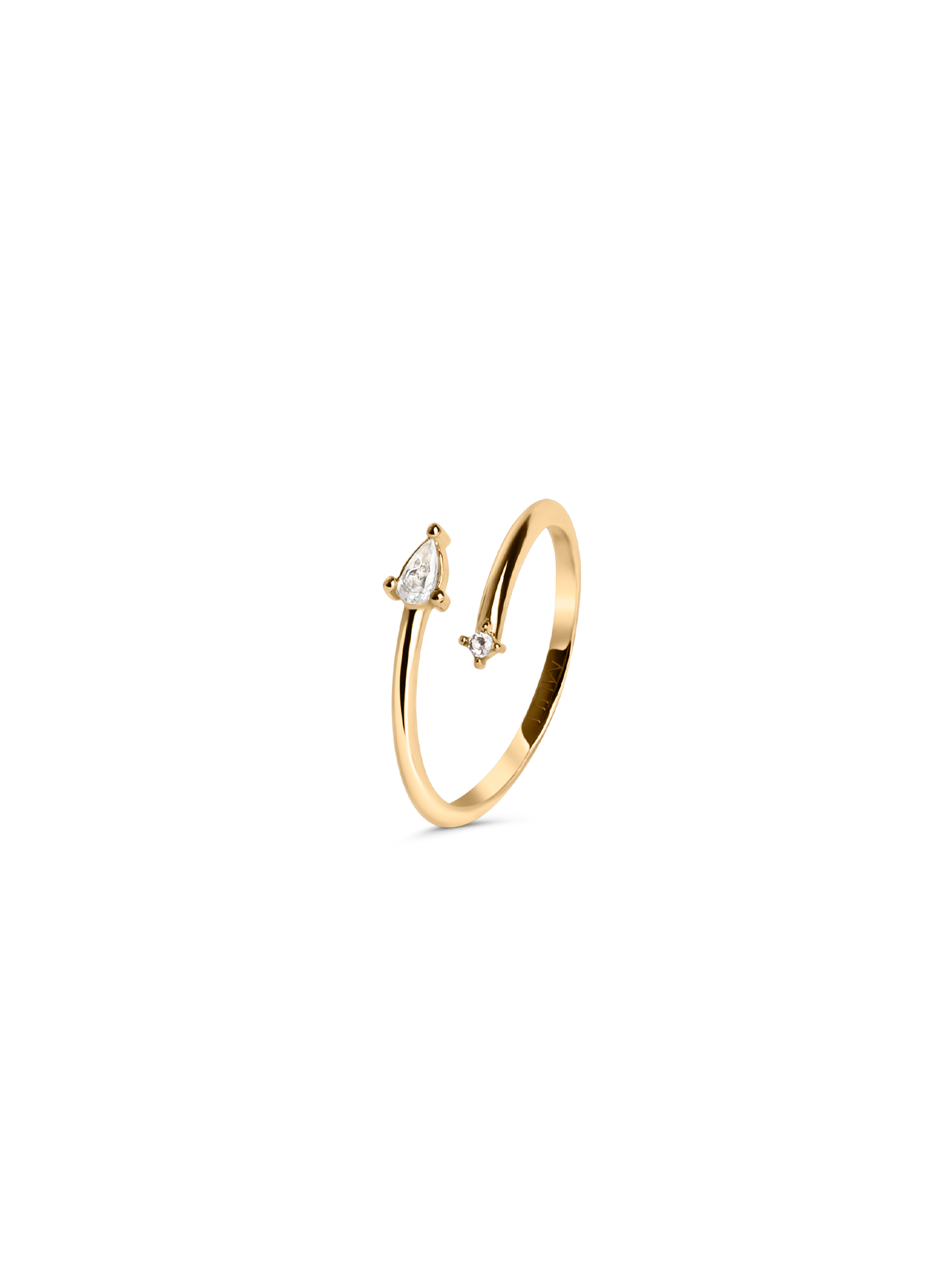 At each end of the ring, there is a small zirconia stone that adds a subtle detail. The stones are placed to create a balanced look, making the ring easy to wear on its own or combine with other rings. The simple structure of the Adjustable Mini Drop Ring makes it suitable for stacking with other styles or wearing alone for a more understated look. Its smooth surface feels comfortable on the finger and pairs naturally with other gold-toned jewelry. This ring is also a practical choice if you are looking for a gift. It is delivered in a Muli Collection branded pouch, ready for storage or if you plan to give the ring as a gift.