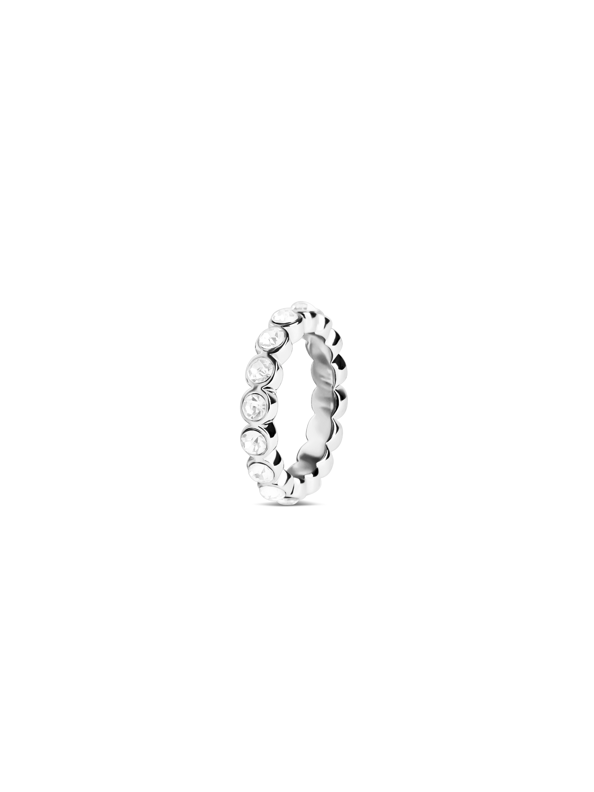 Our Lotus Ring Silver is designed with a clean and simple look that works well for everyday wear. It is made of 925 silver plated brass and is decorated with round crystal stones placed evenly around the entire ring. The stones create a steady line of light that fits many styles and can be worn on its own or with other rings. The ring has a 4 mm width, giving it a balanced shape that feels comfortable on the hand while still being visible. The smooth inside makes it easy to wear throughout the day, and the gold plated surface adds a silver tone that pairs well with other jewelry.