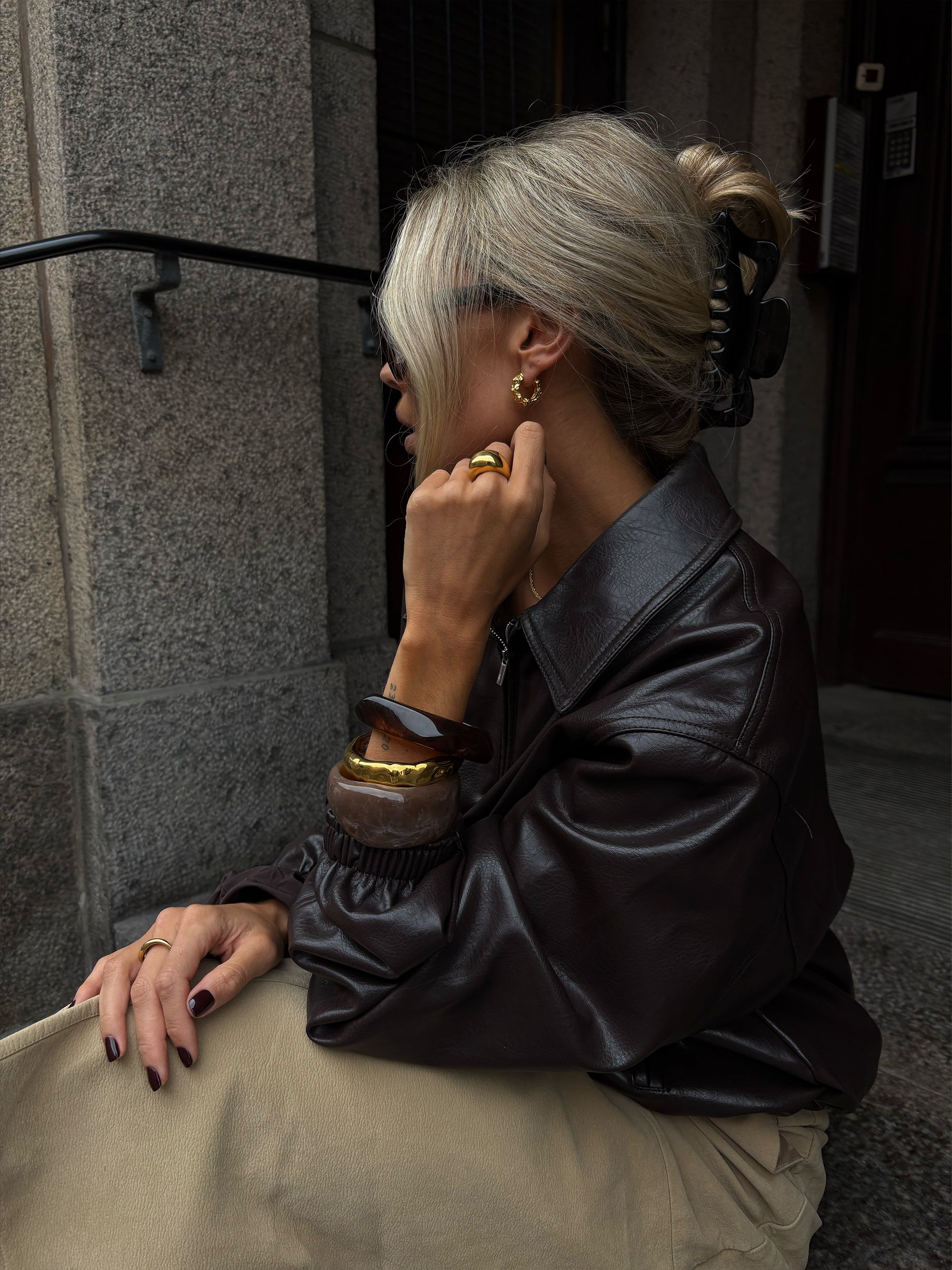 The Resin Bangle Bracelet Taupé is a simple and stylish accessory made to fit into your everyday jewelry collection. With its smooth surface and asymmetrical shape, it’s easy to wear and matches well with a variety of outfits. The Taupé color gives a soft, neutral tone that complements both casual and more dressed-up styles.