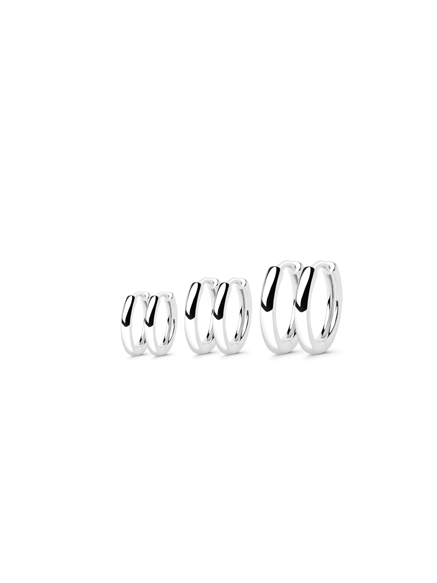 The set includes: 1 pair of 10mm Basic Huggies, 1 pair of 15mm Basic Hoops, 1 pair of 20mm Basic Hoops