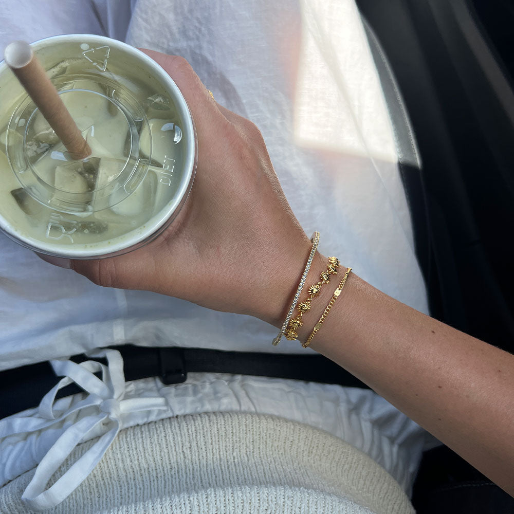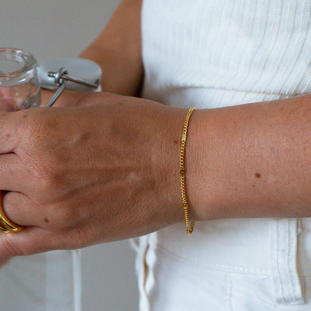 The Beaded Curb Chain Bracelet is designed with a classic curb chain pattern, combined with small bead accents that add subtle texture and detail. The clean and structured design makes this bracelet easy to wear with many different outfits and jewelry styles. It can be worn on its own for a simple everyday look or layered with other bracelets for a more personal expression.