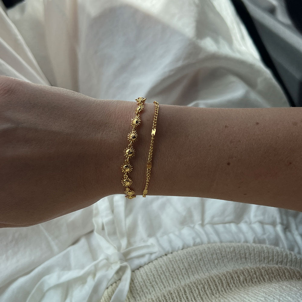Made from 18k gold plated brass, the bracelet has a warm gold tone and a smooth, polished surface. It measures 16 cm in length with an additional 2 cm extension, allowing for an adjustable fit that sits comfortably on the wrist.