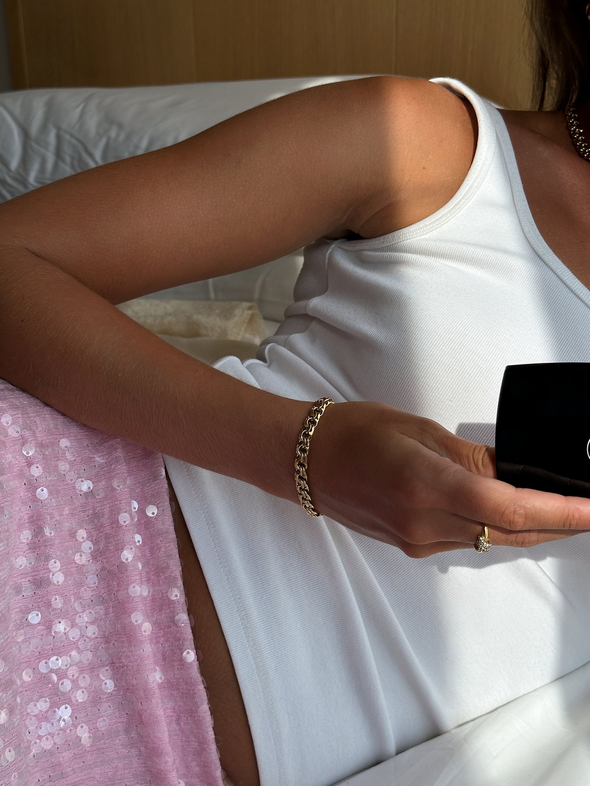 Our Bismarck Bracelet is a structured bracelet designed for everyday wear. It is crafted from waterproof 18k gold PVD plated brass, offering a polished gold tone that works well with both casual and more styled outfits. The bracelet features a traditional Bismarck link design known for its closely connected links that sit smoothly against the skin.