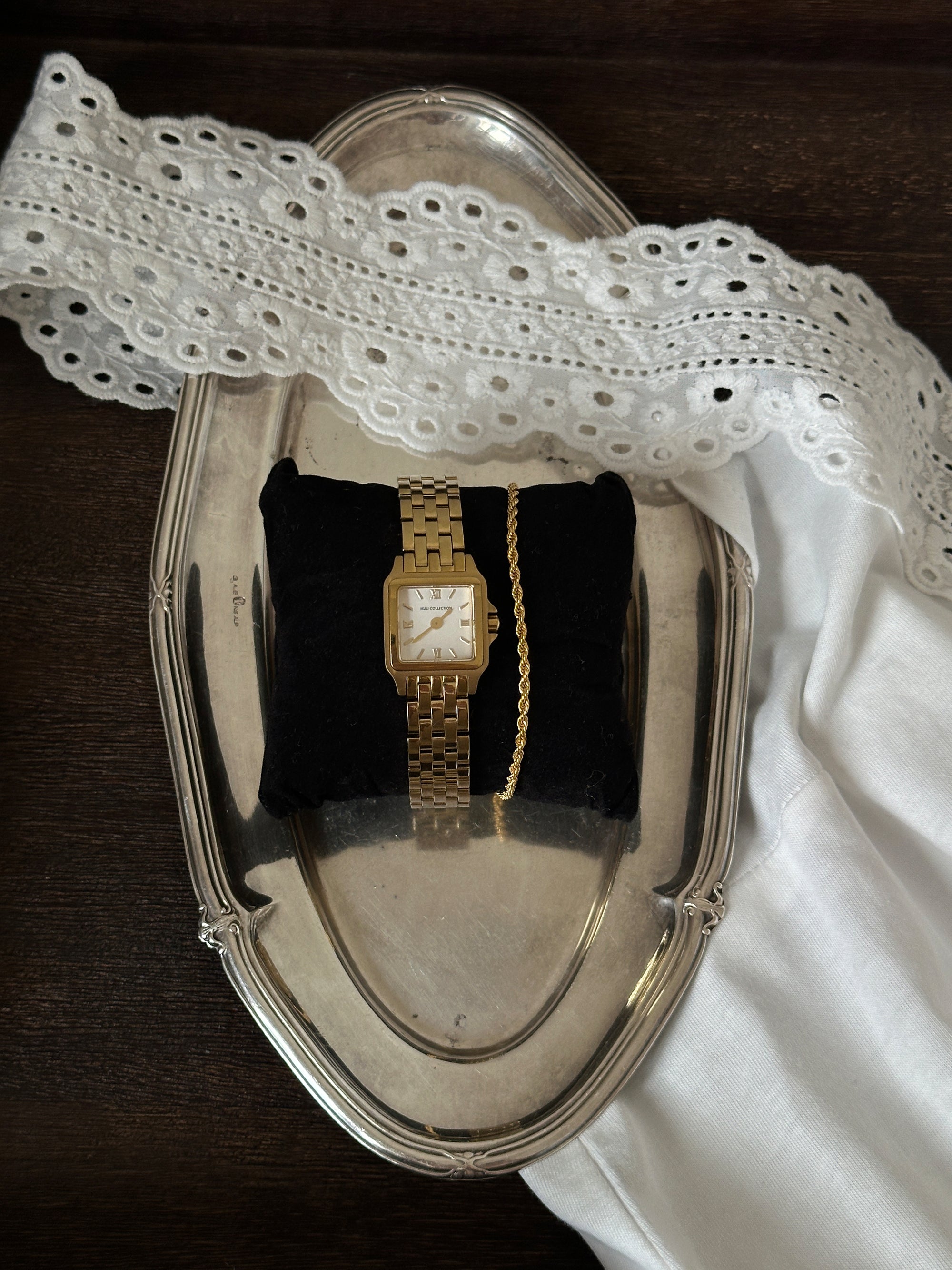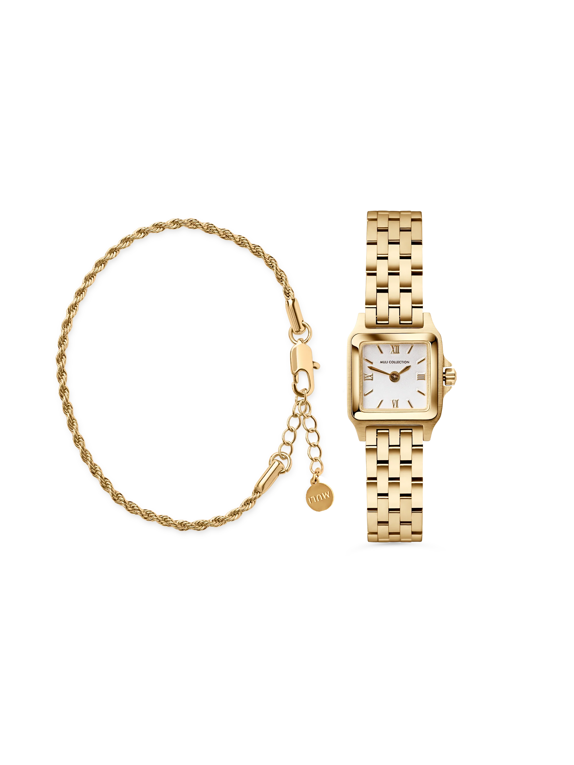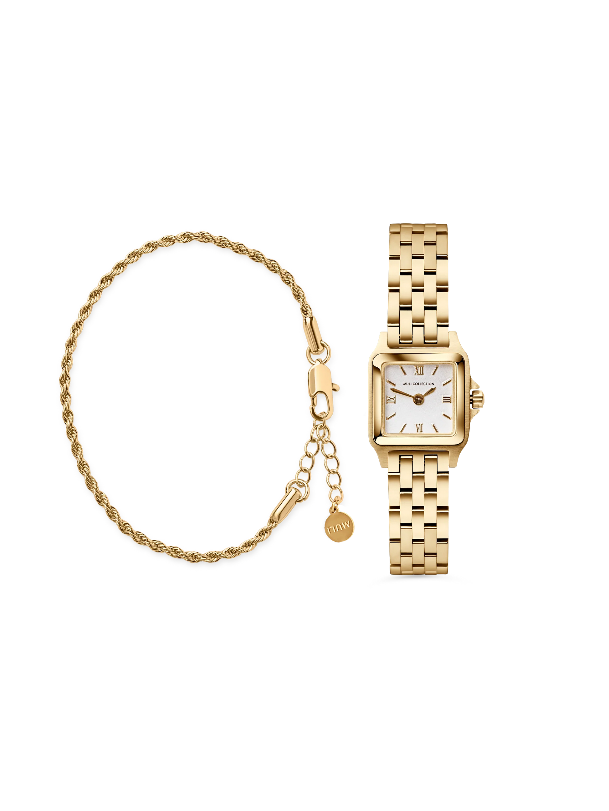 The watch features a timeless and classic design with a square dial and the matching Rope Chain Bracelet adds structure with its twisted design, making the combination easy to wear. Together, they create a style that can be worn alone or layered with other jewelry.