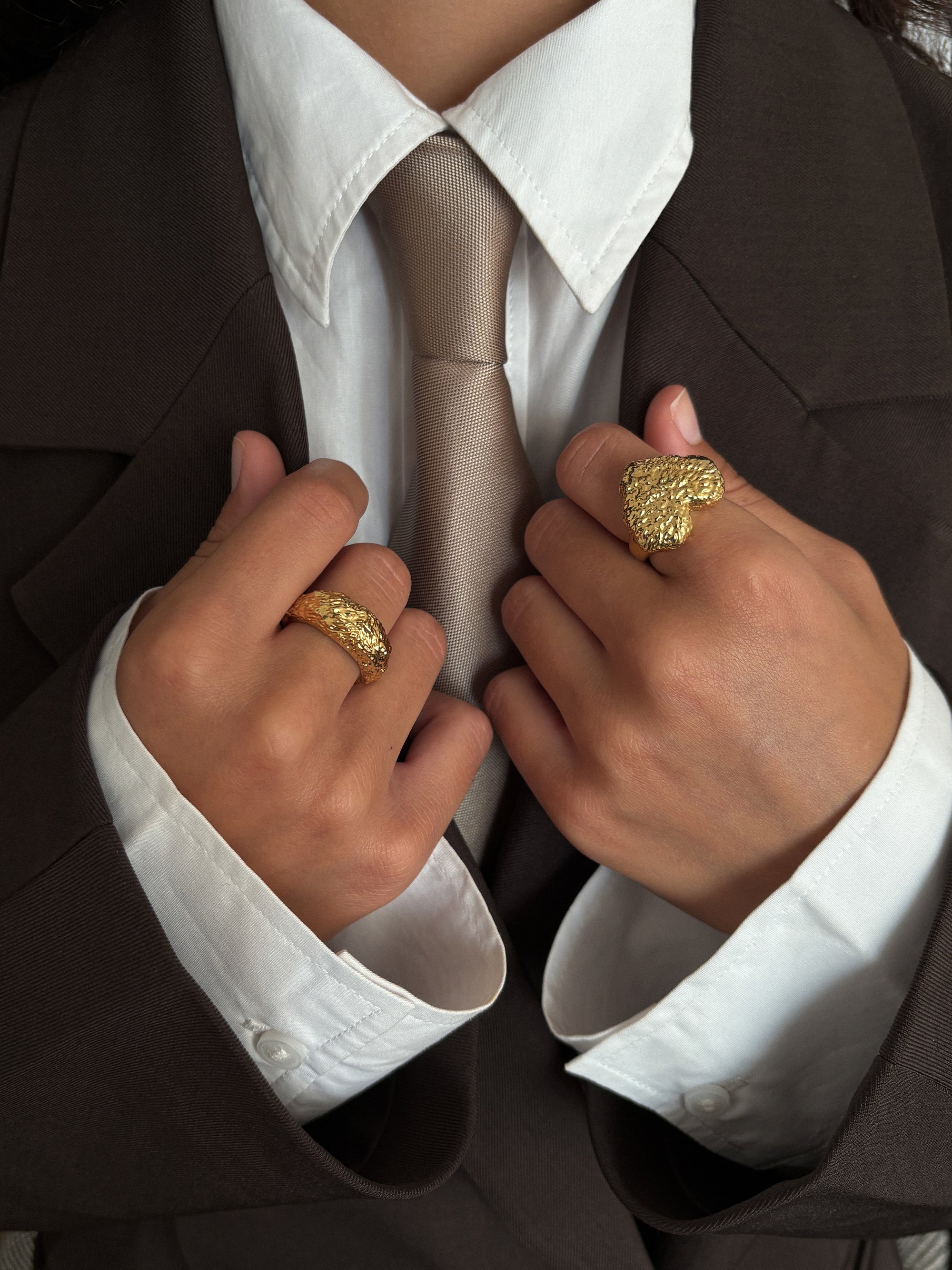 Our Textured Dome Ring is made of waterproof 18k gold PVD plated brass, a durable material that helps the ring keep its color and shine over time. With a width of 1 cm, the ring has a bold shape that feels balanced while still being comfortable to wear.