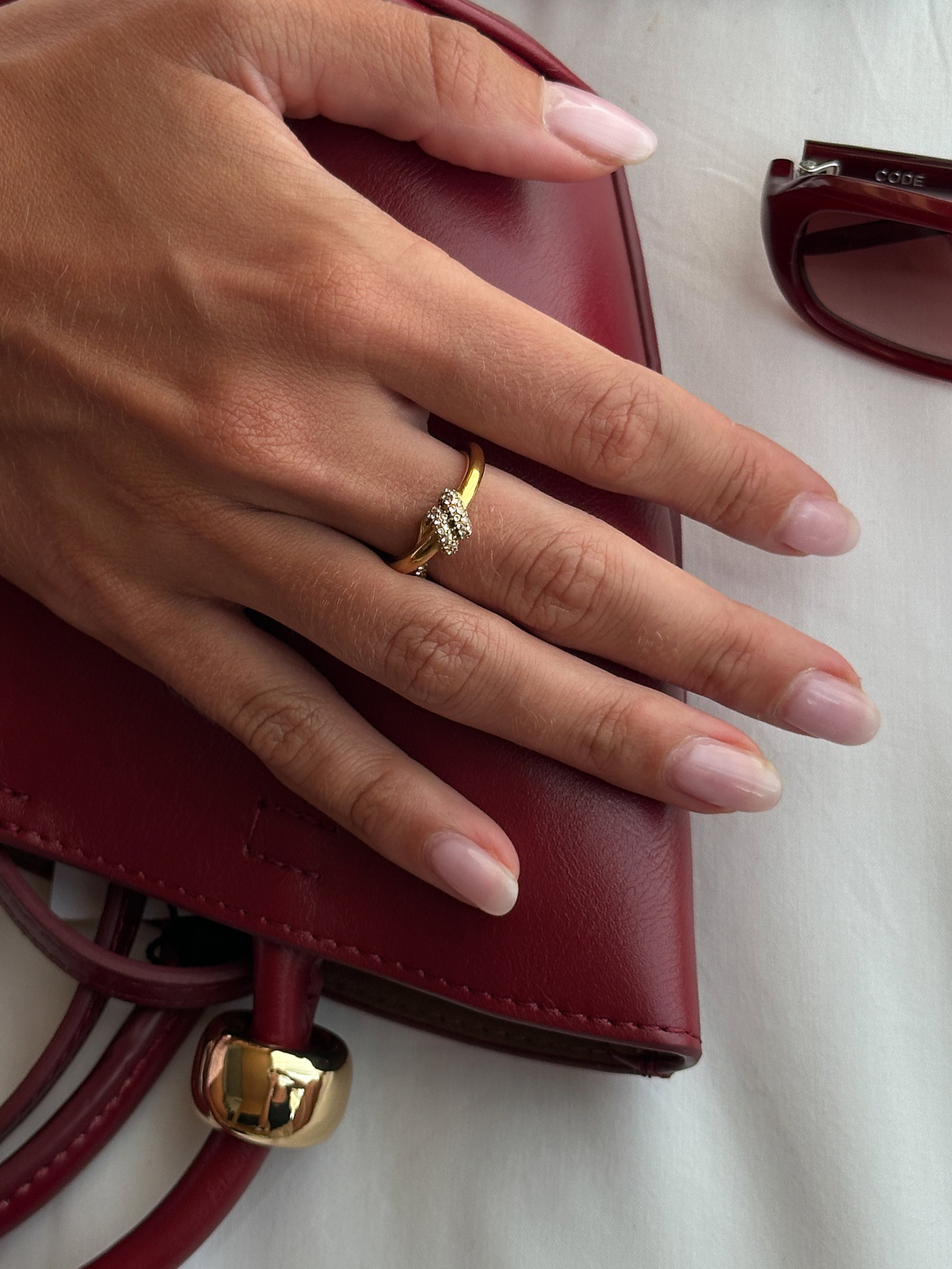 Pavé Knot Ring är en ring som passar både till vardags och vid mer uppklädda tillfällen. Den är tillverkad i vattentåligt 18k guld PVD pläterat stål. Ytan är slät och den polerade guldfärgen håller sig fin över tid. Ringen består av två sammanlänkade ringband som möts i en tvinnad knut, vilket ger en tydlig men stilren form som syns utan att ta över.